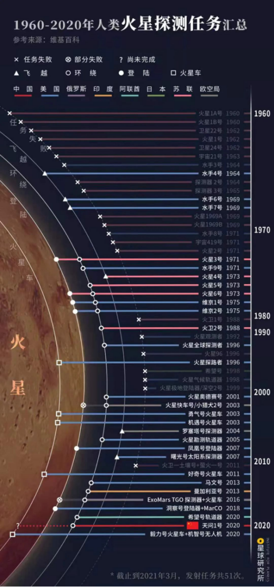 (1960-2020人类火星探测任务汇总,制图@王申雯/星球研究所)