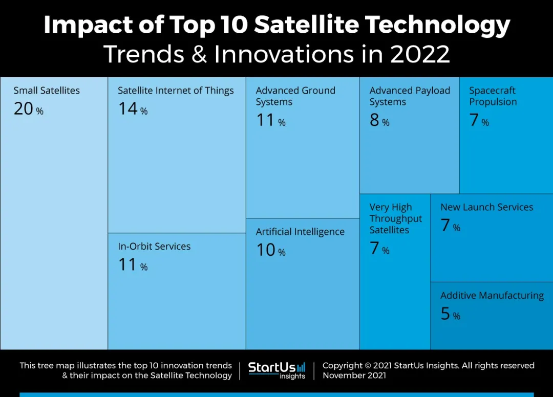卫星的技术创新使整个航天工业取得了很大的进步。现在小型化卫星或小卫星,特别是纳卫星,已成为卫星发展的一个重要趋势,它们推动了下一代卫星的性能,而且小卫星的低制造成本也为卫星的量产化铺平道路。卫星物联网(IoT)是另一个主要趋势,可实现前所未有的跨行业连接,并为5G和即将到来的6G提供支持。同时,卫星制造商和运营商正在积极推进地面站和在轨服务的技术创新。数字化载荷、推进系统和人工智能(AI)等技术的应用将使卫星能够自主执行更复杂的功能。由于政府和私人投资的增加,从事卫星制造、运营和服务的初创公司正在为小型智能卫星的新时代奠定基础。